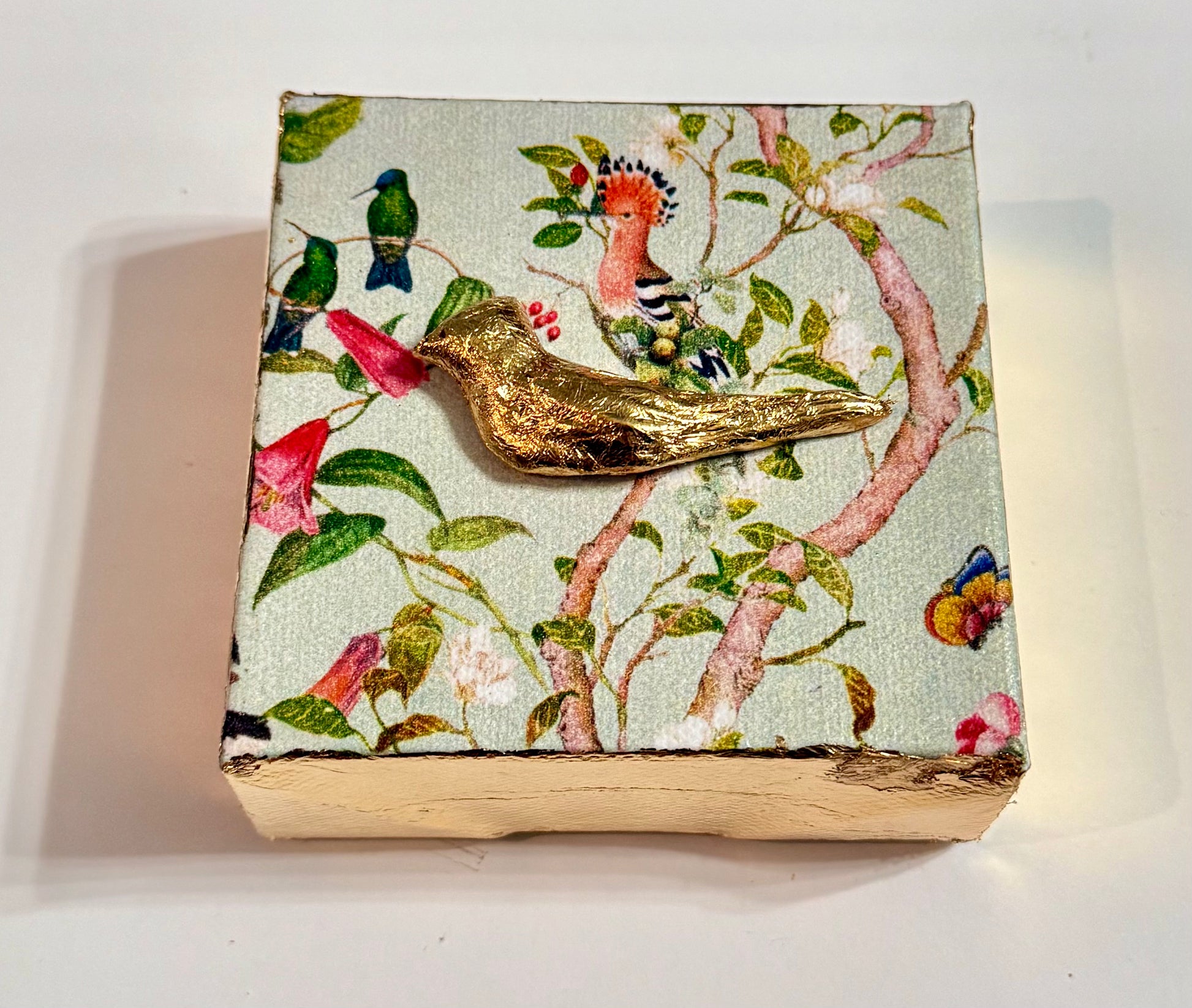 Infuse elegance into your home with the Golden Cardinal | Floral and Bird canvas. Featuring a gold-leafed cardinal amidst a 4x4 blue and white floral canvas, this piece is sure to add a touch of sophistication to any room. The canvas is also beautifully edged in gold-leaf, adding a luxurious finish to this stunning artwork.