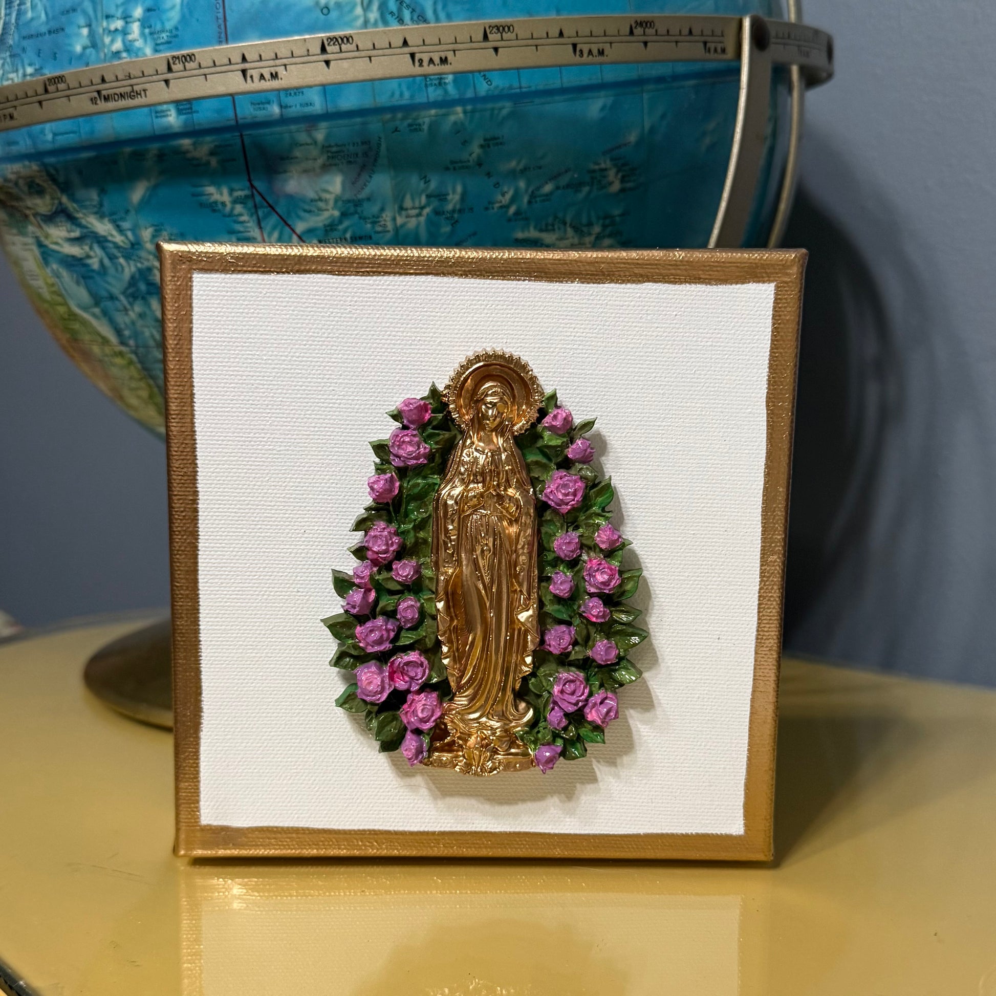 This 6x6 canvas features a handmade and painted Mary, beautifully surrounded by flowers. The edges are finished with a touch of gold, adding an elegant touch to this religious art piece. Perfect for gifting or adding a peaceful touch to any room.